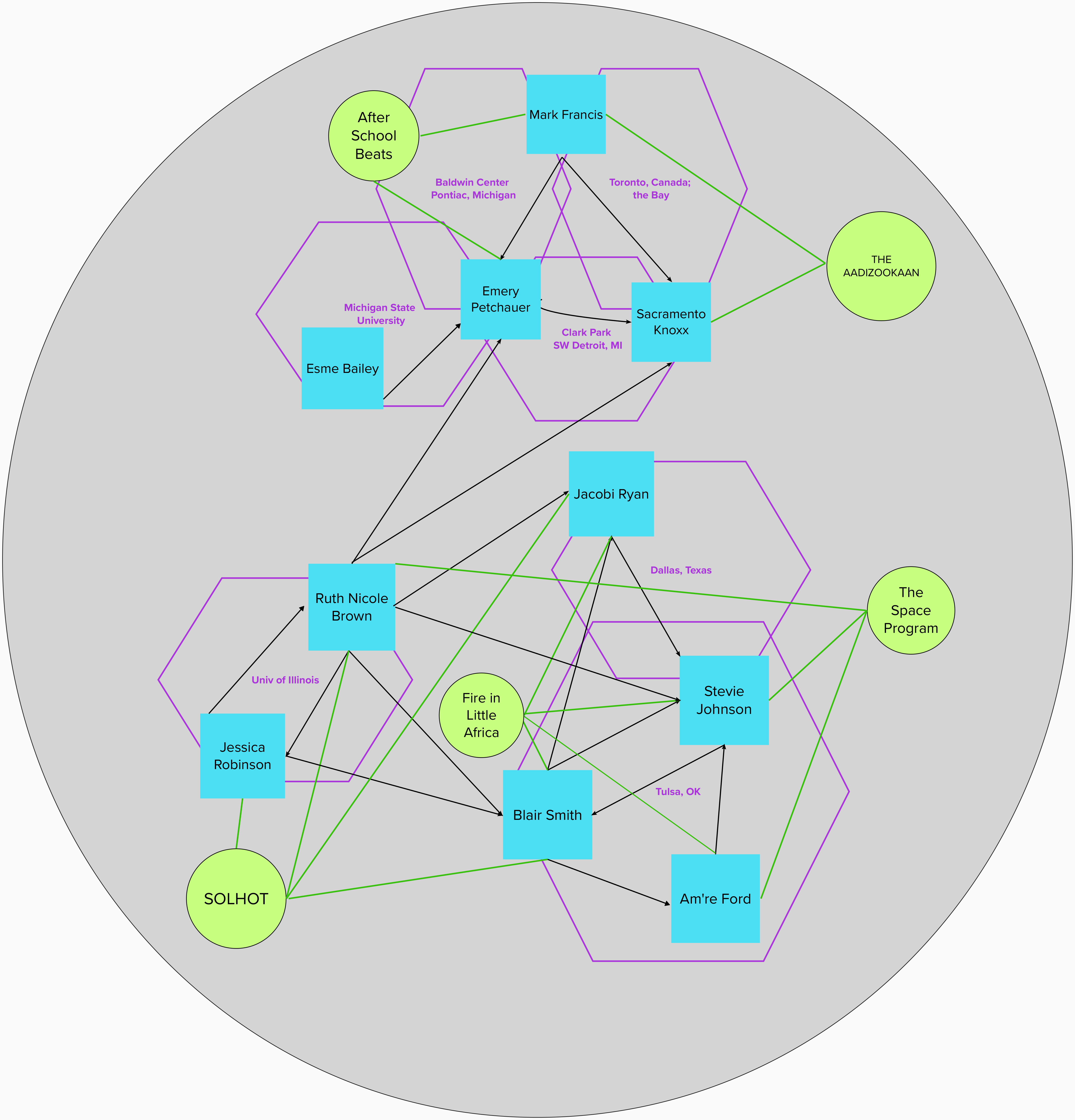 Figure 4. Map of relationships among people, collectives, and spaces at the start of this project. We surfaced these connections in response to the following conversation prompt: Tell a story about an experience you had with someone else in this group that makes you excited they are here today. The green circles are collectives. The purple spaces are lands and institutions elicited by our stories. The lines between us represent connections also elicited by our stories. We understand these existing relationships, some dating back to over a decade, created the conditions of desire, trust, and solidarity for this project.